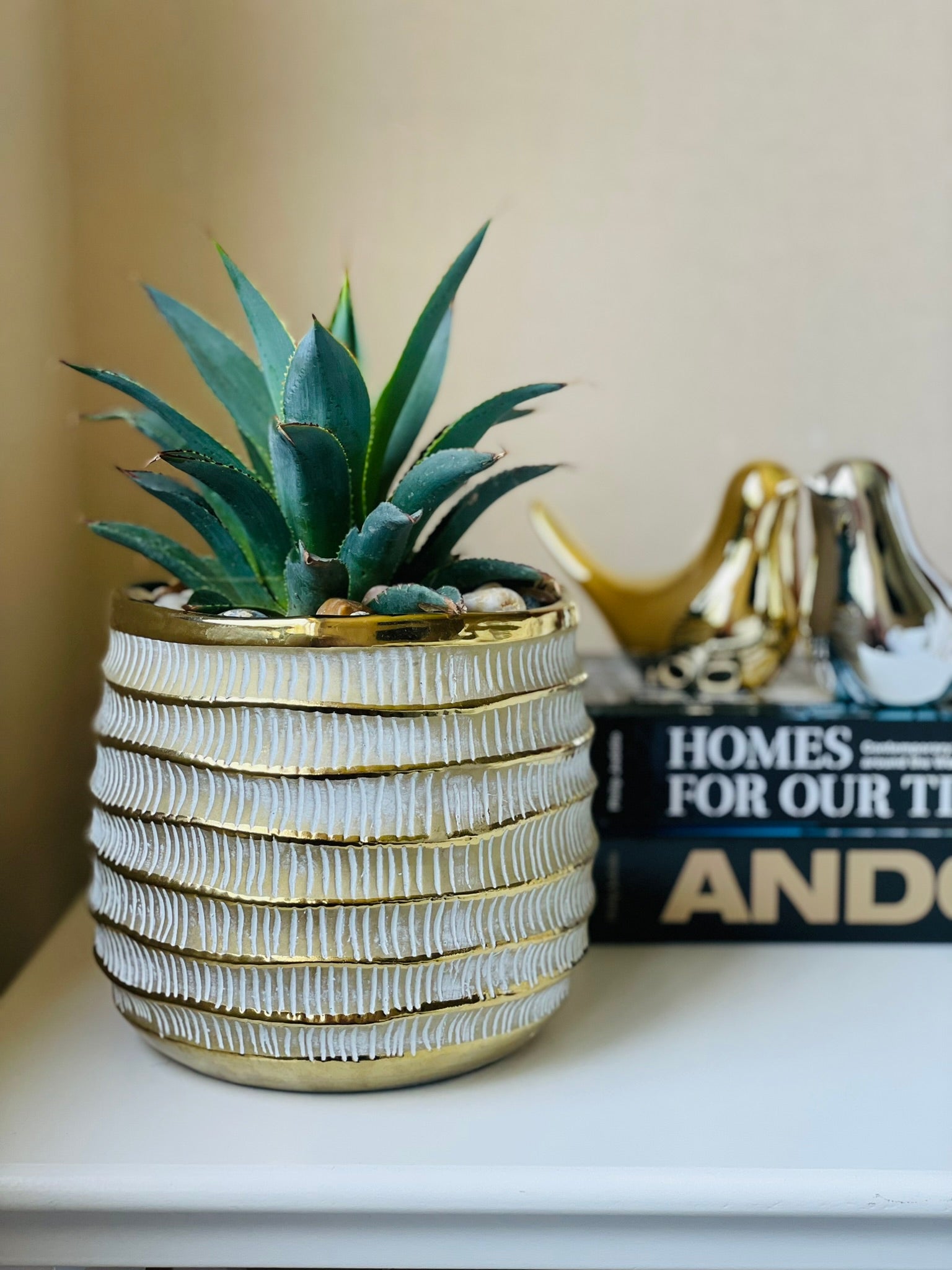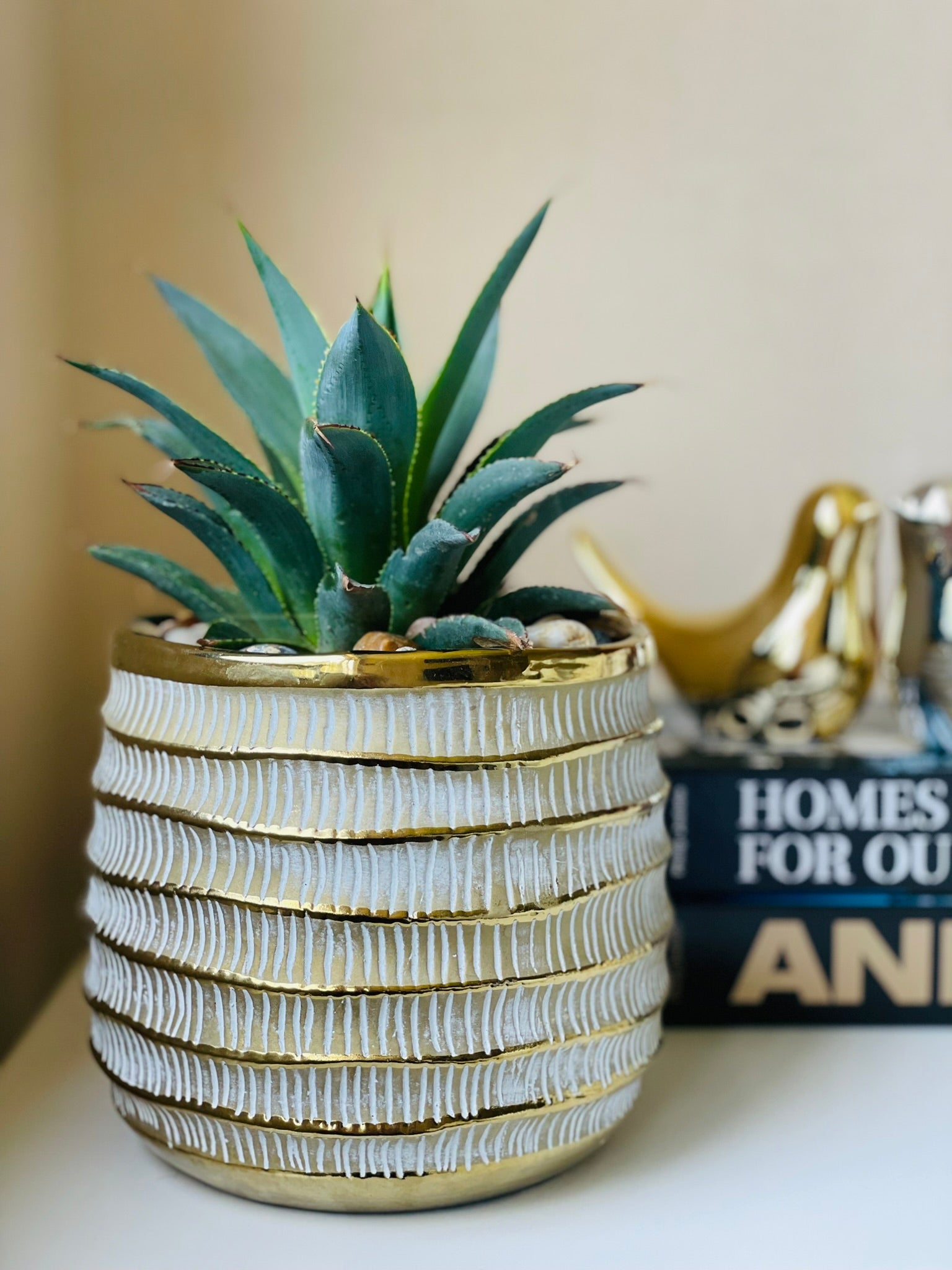 Agave afterglow en maceta de cerámica tamaño "M" color dorado con diseño y acolchado superior de piedras de río pulidas.