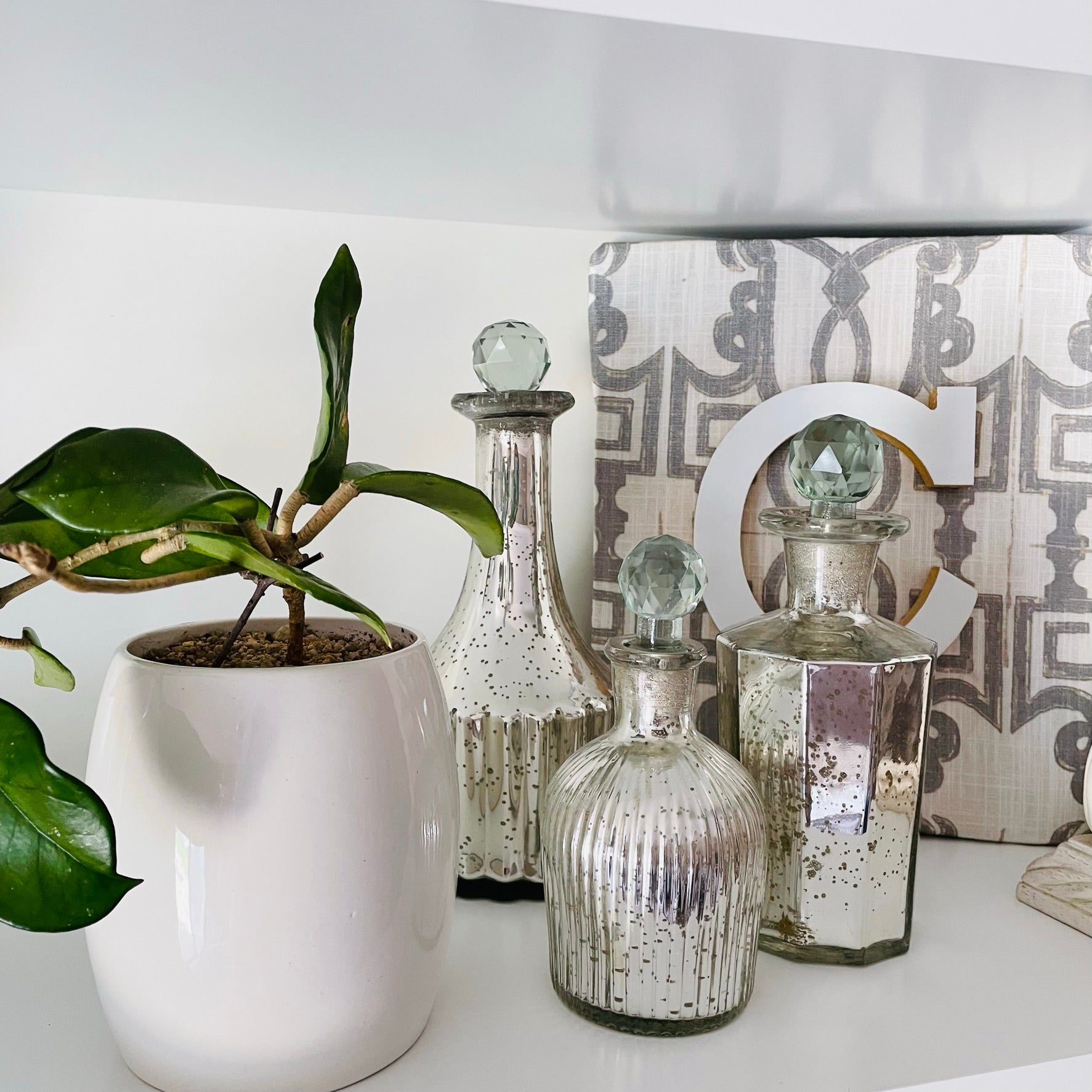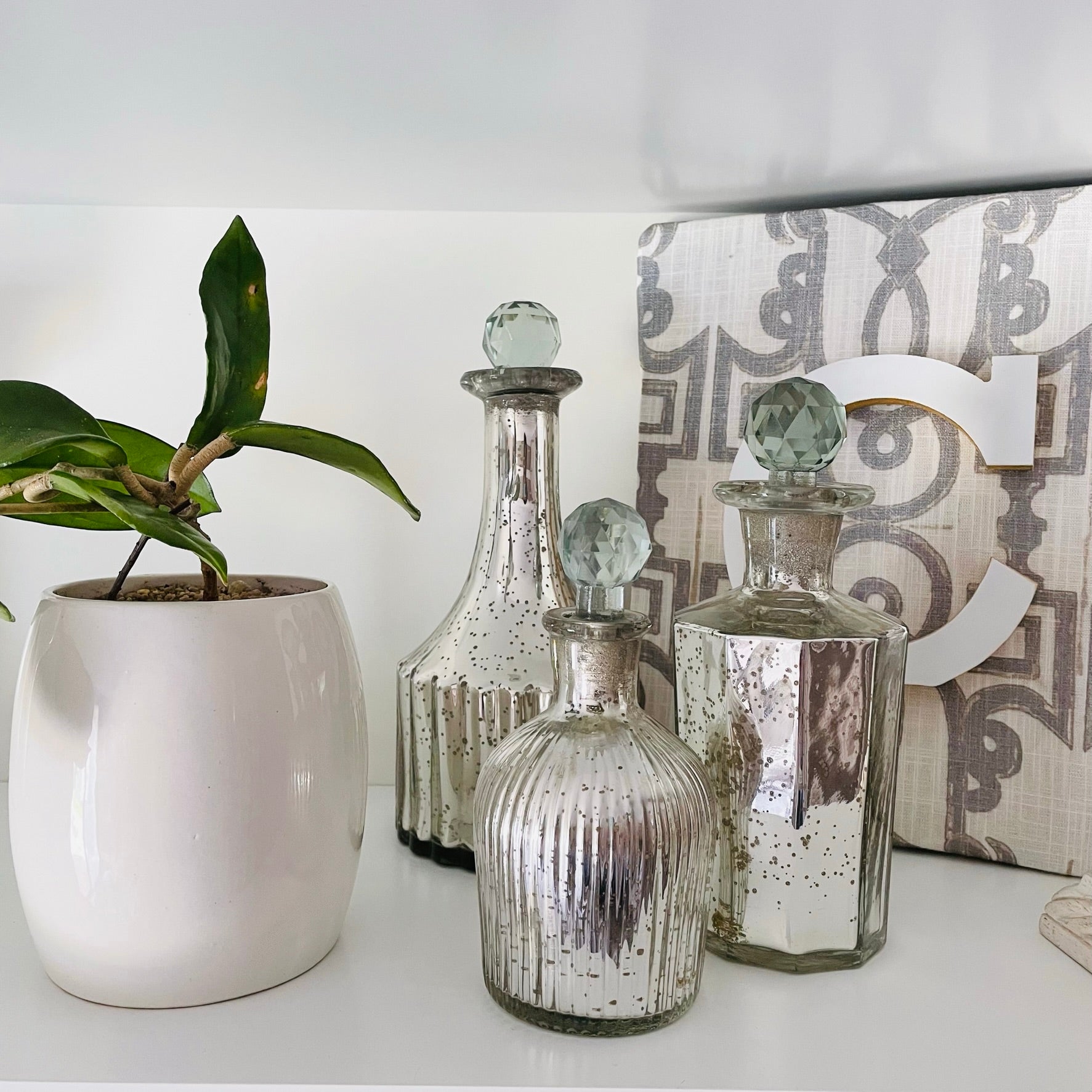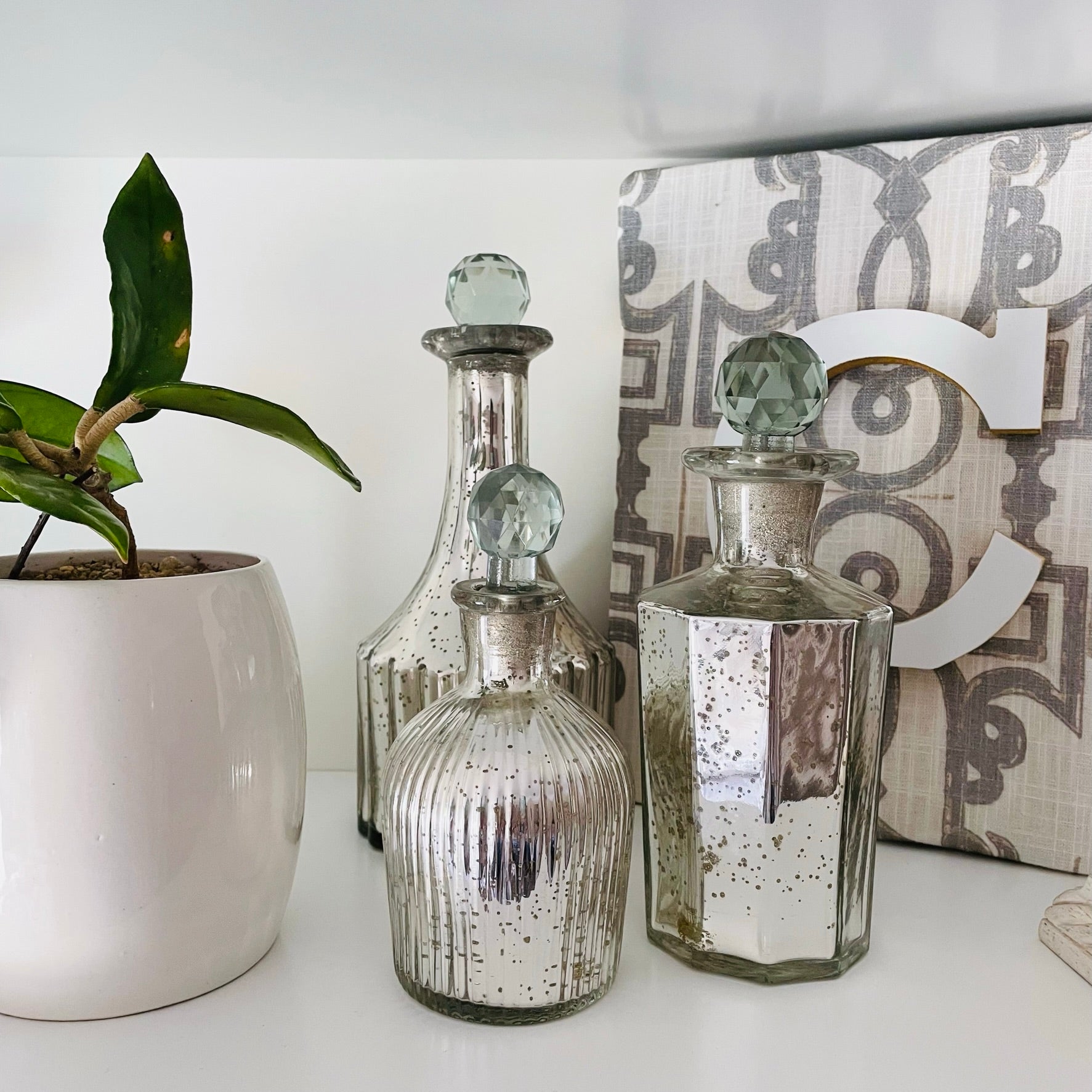 Botella decorativa de vidrio con tapa color plateado con acabado envejecido.