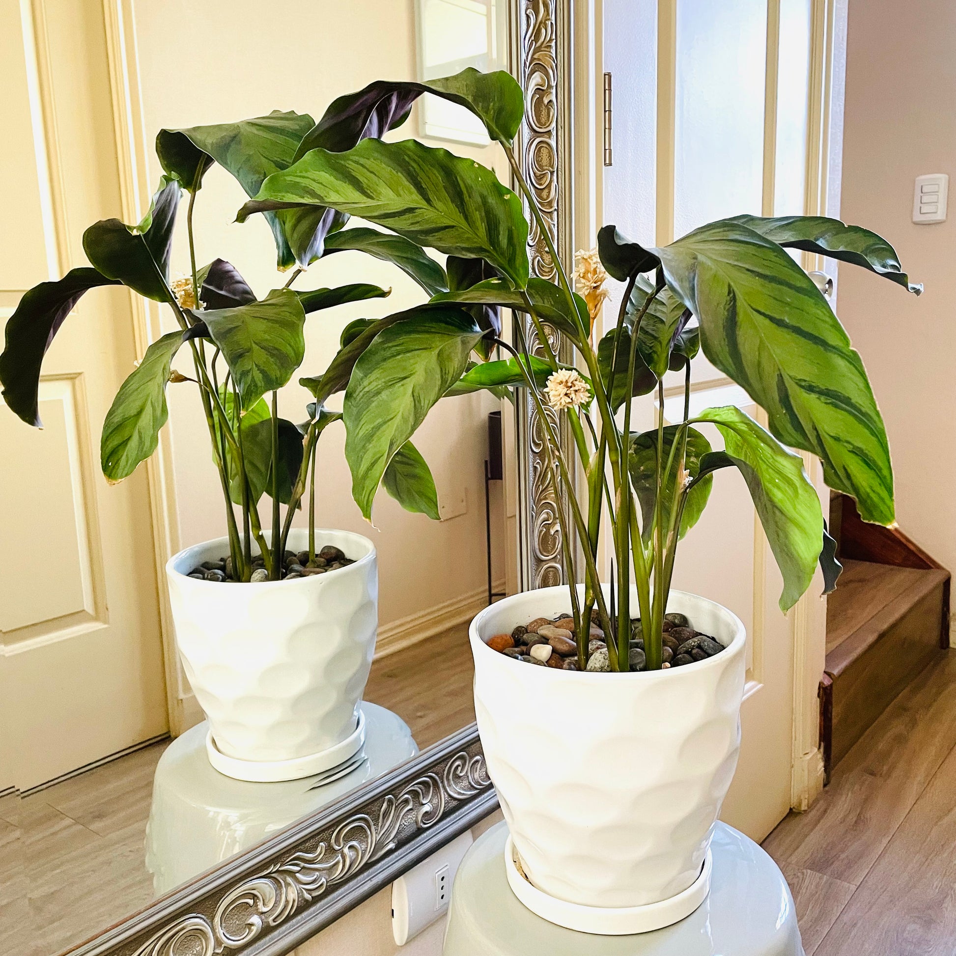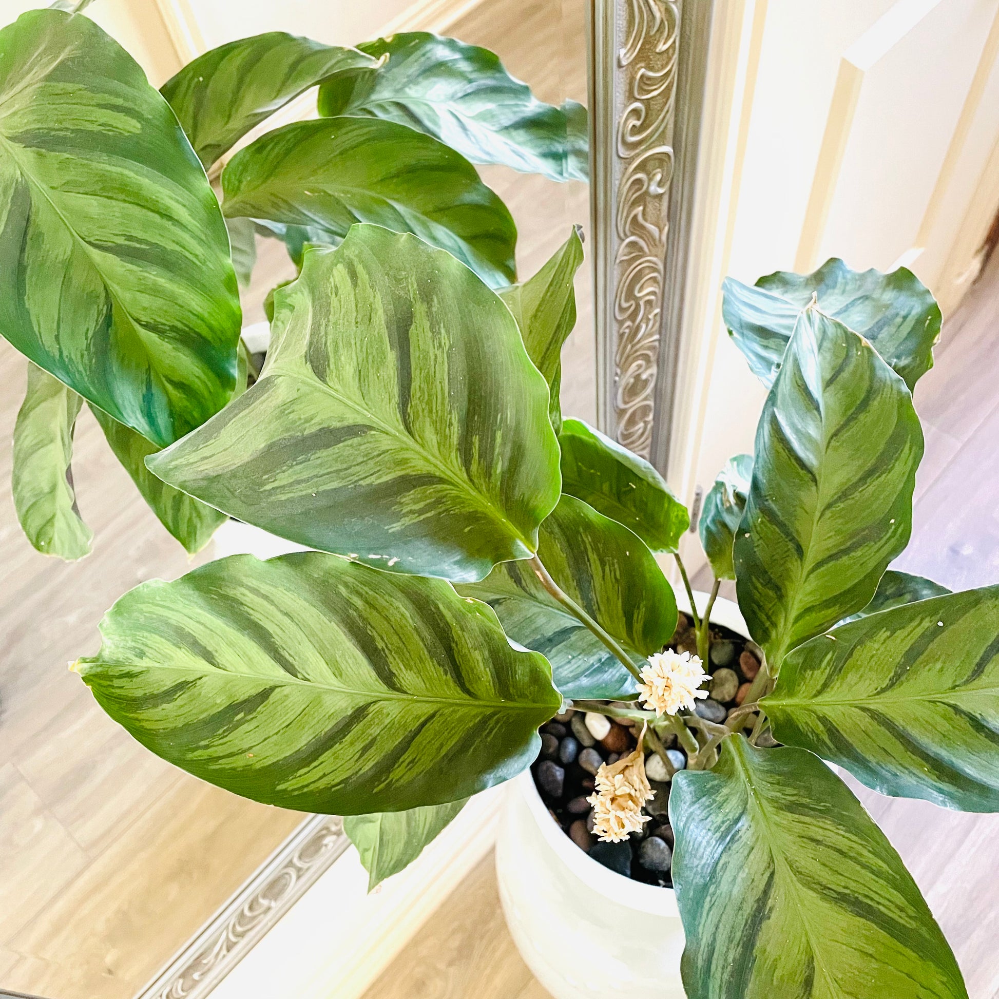 Calathea louisae en maceta de cerámica color blanco tamaño “L” y acolchado superior de piedra ágata.