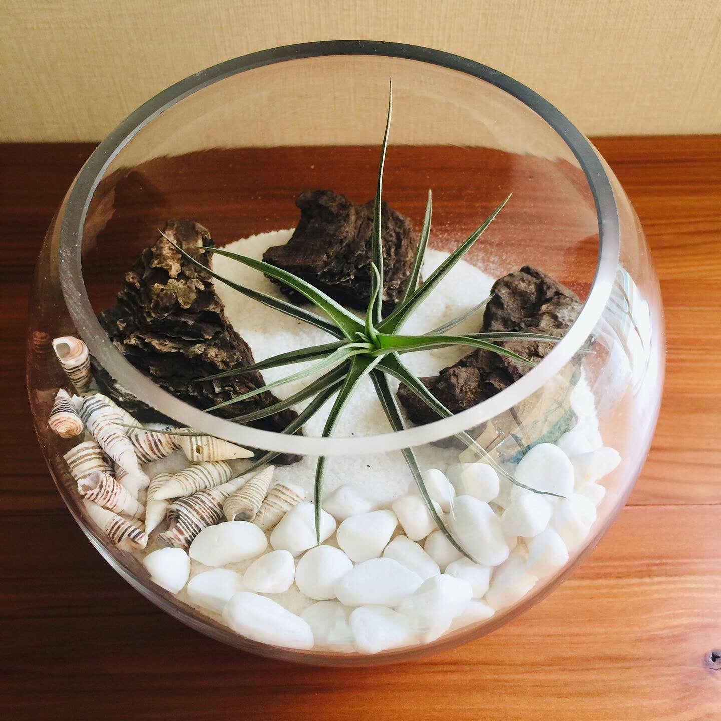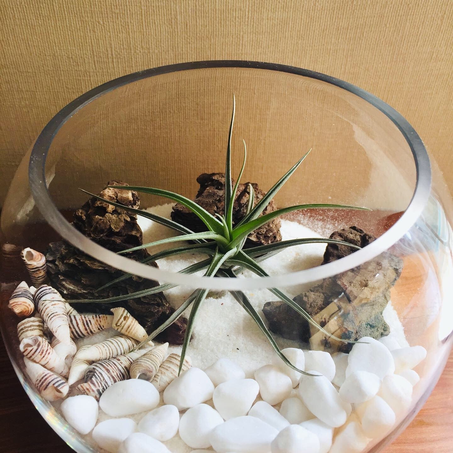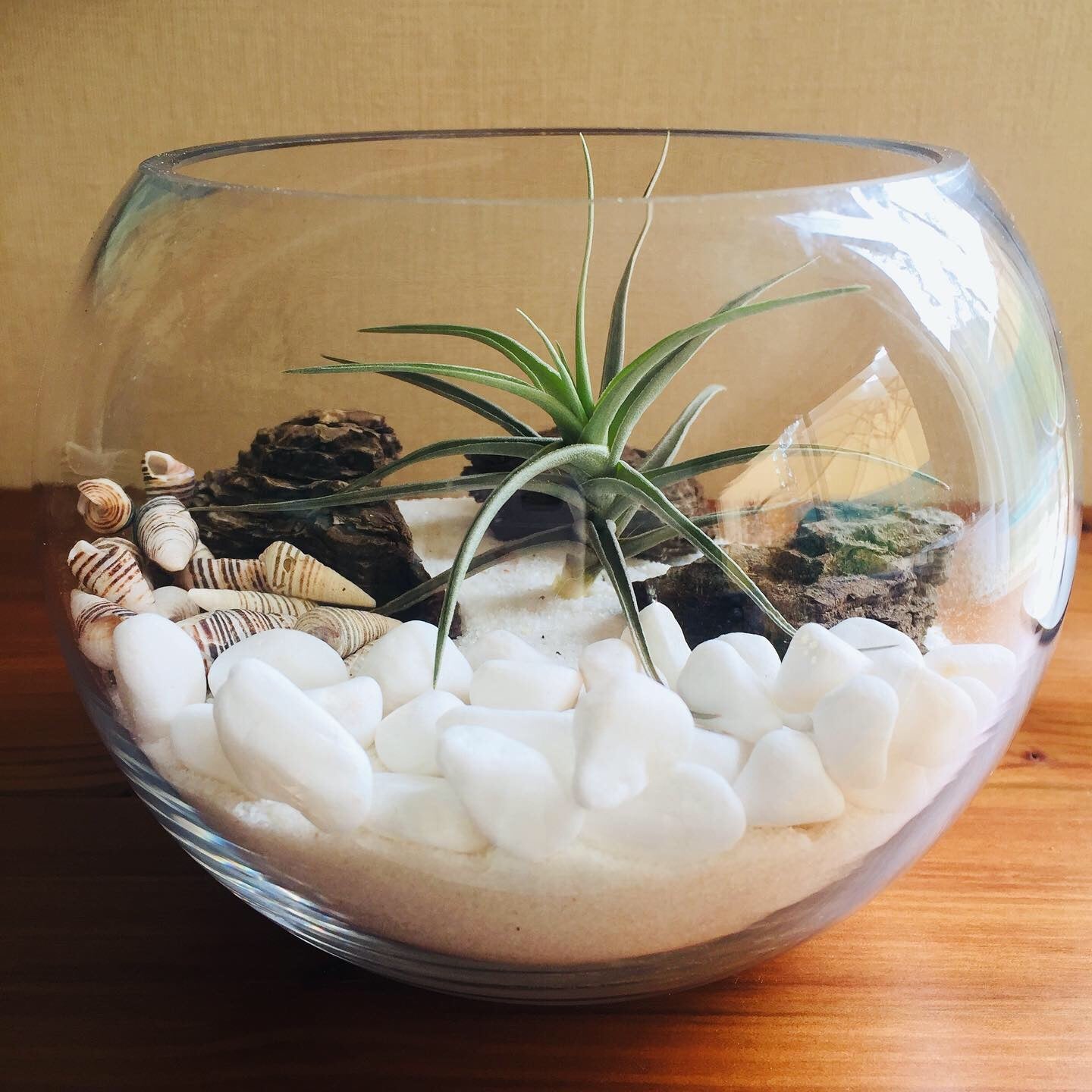 Clavel del aire en pecera de vidrio con arena, corteza de pino, piedras y caracoles de mar.