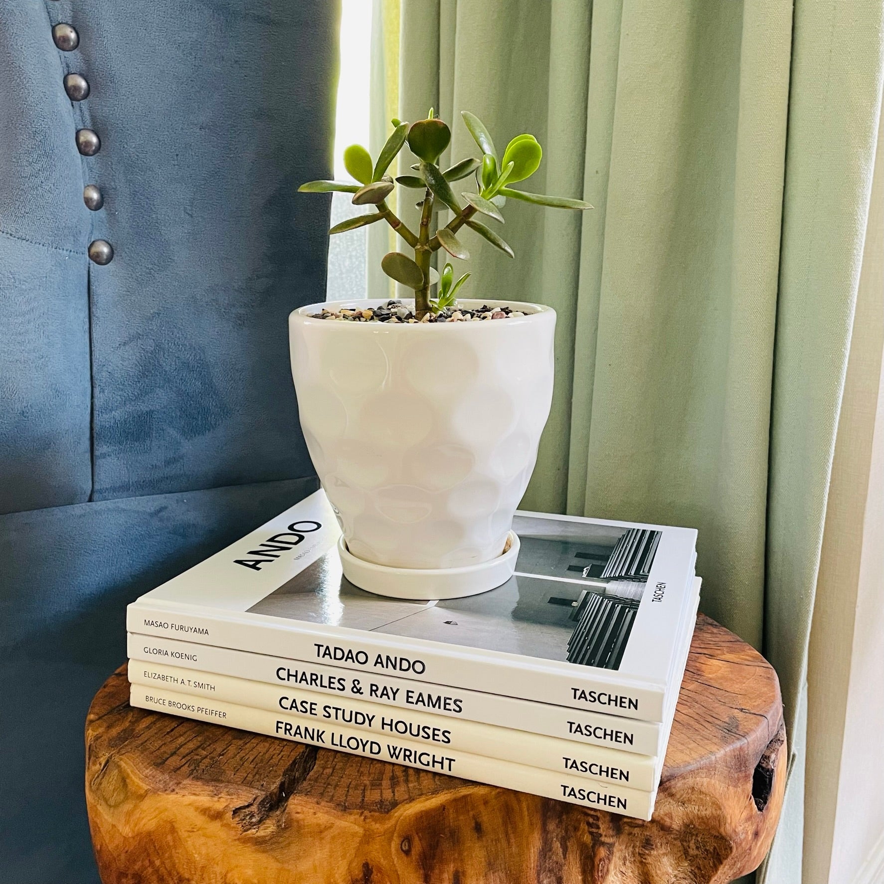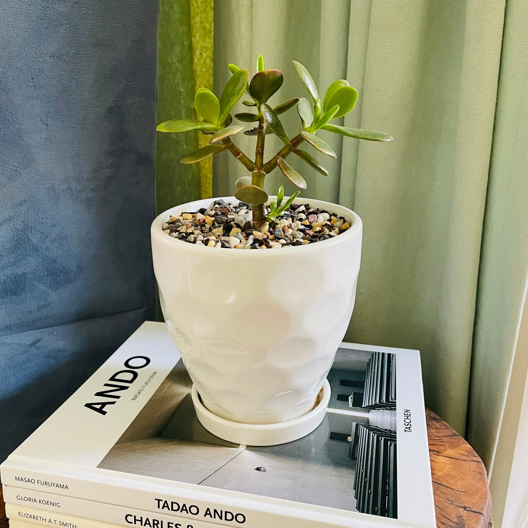 Crasula ovata en maceta de cerámica de tamaño "S" color blanco y acolchado superior de piedrecillas multicolor. Según la tradición del Feng-shui, la planta de Jade trae prosperidad y abundancia. Además de atraer la riqueza, se dice que alivia las tensiones, restablece el equilibrio, la paz y la armonía, y el lugar más indicado para ubicar la planta de Jade es en el lugar de trabajo y también en la entrada de la casa.
