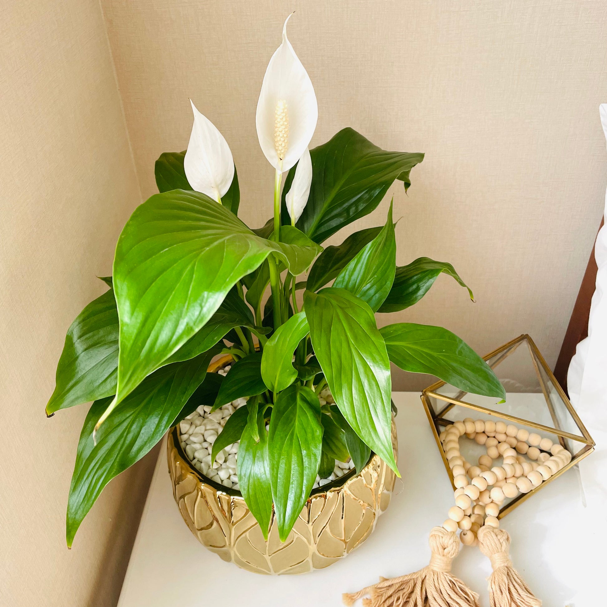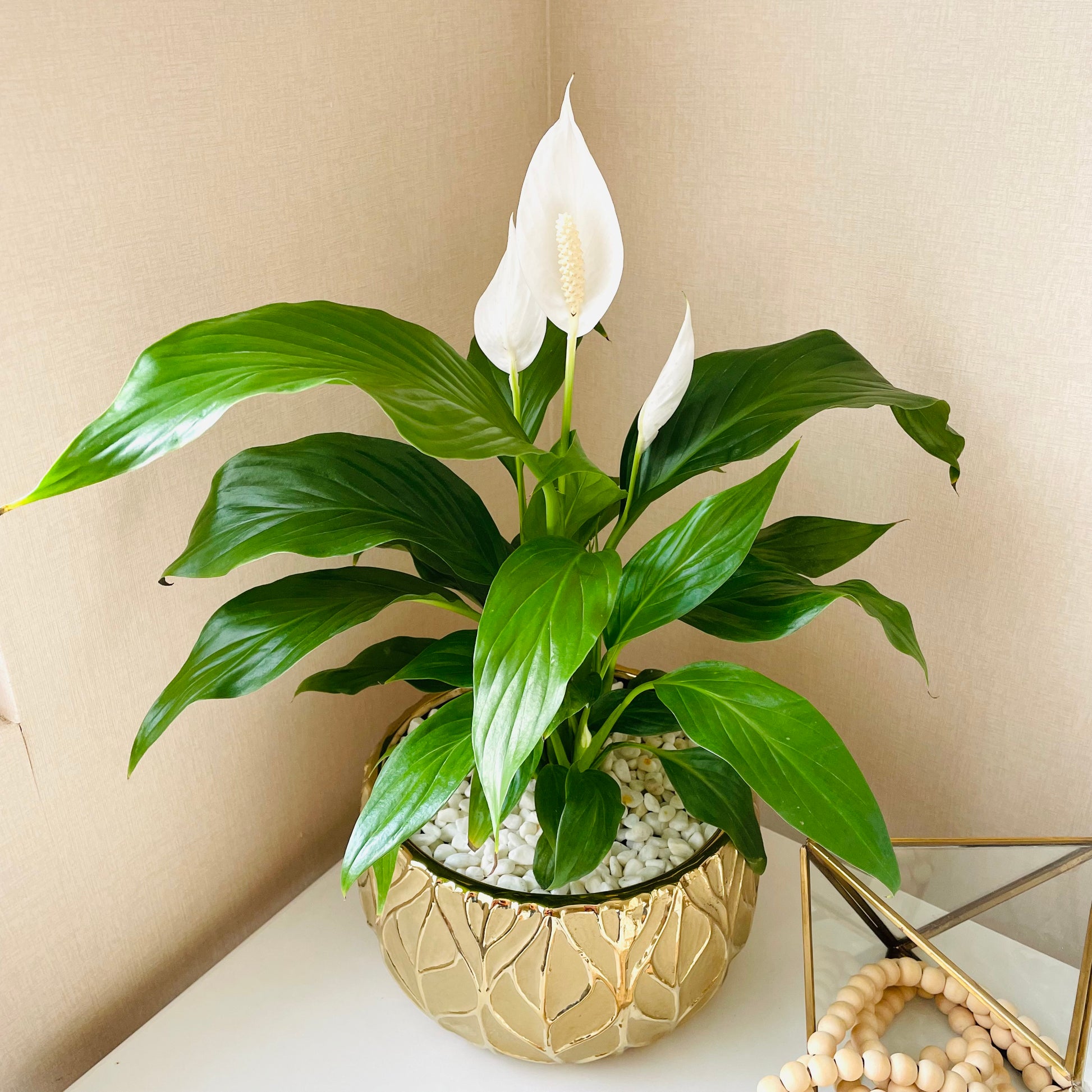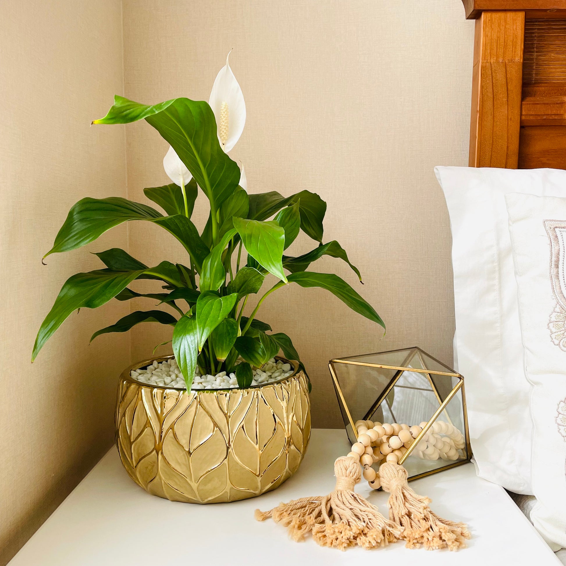 Espatifilo en maceta de cerámica tamaño “L” color dorado y acolchado superior de piedrecillas blancas.