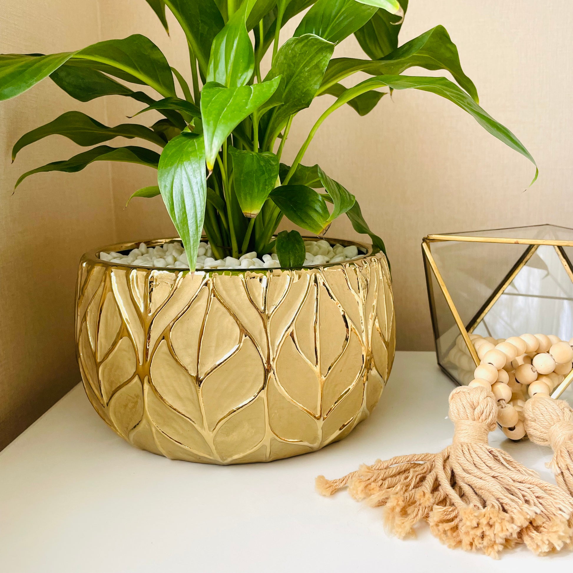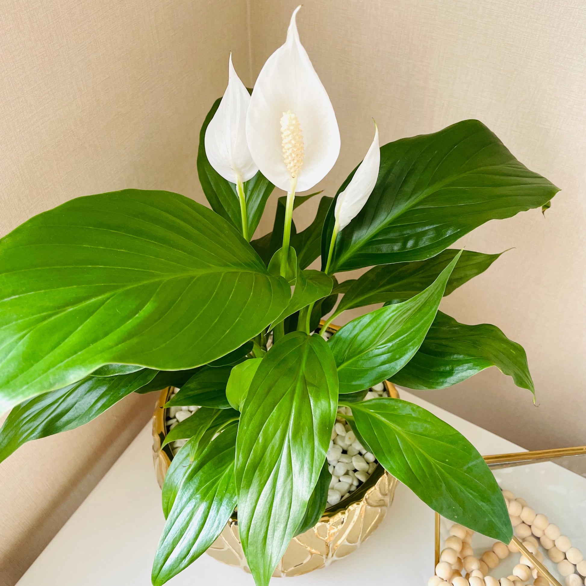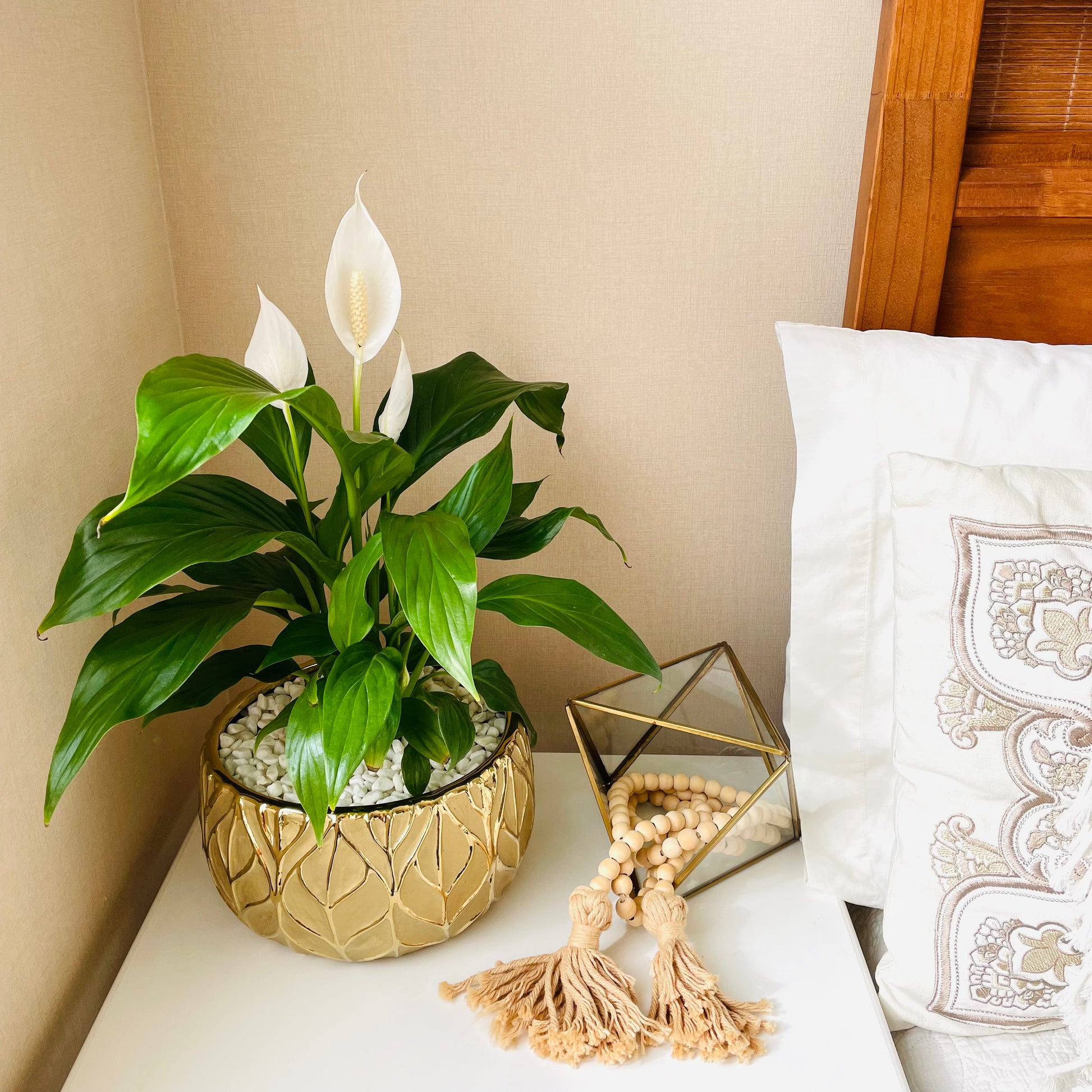 Espatifilo en maceta de cerámica tamaño “L” color dorado y acolchado superior de piedrecillas blancas.