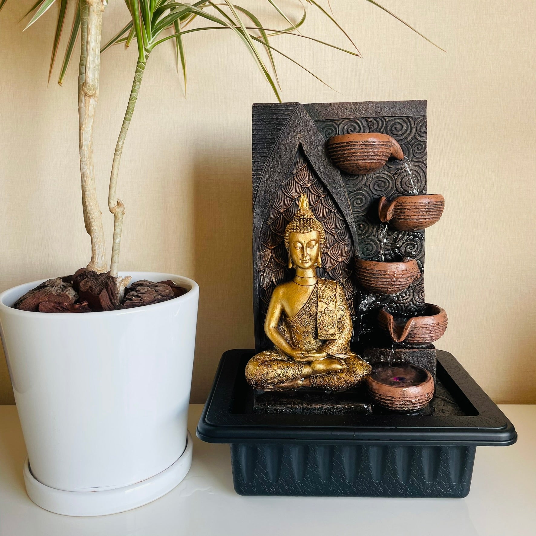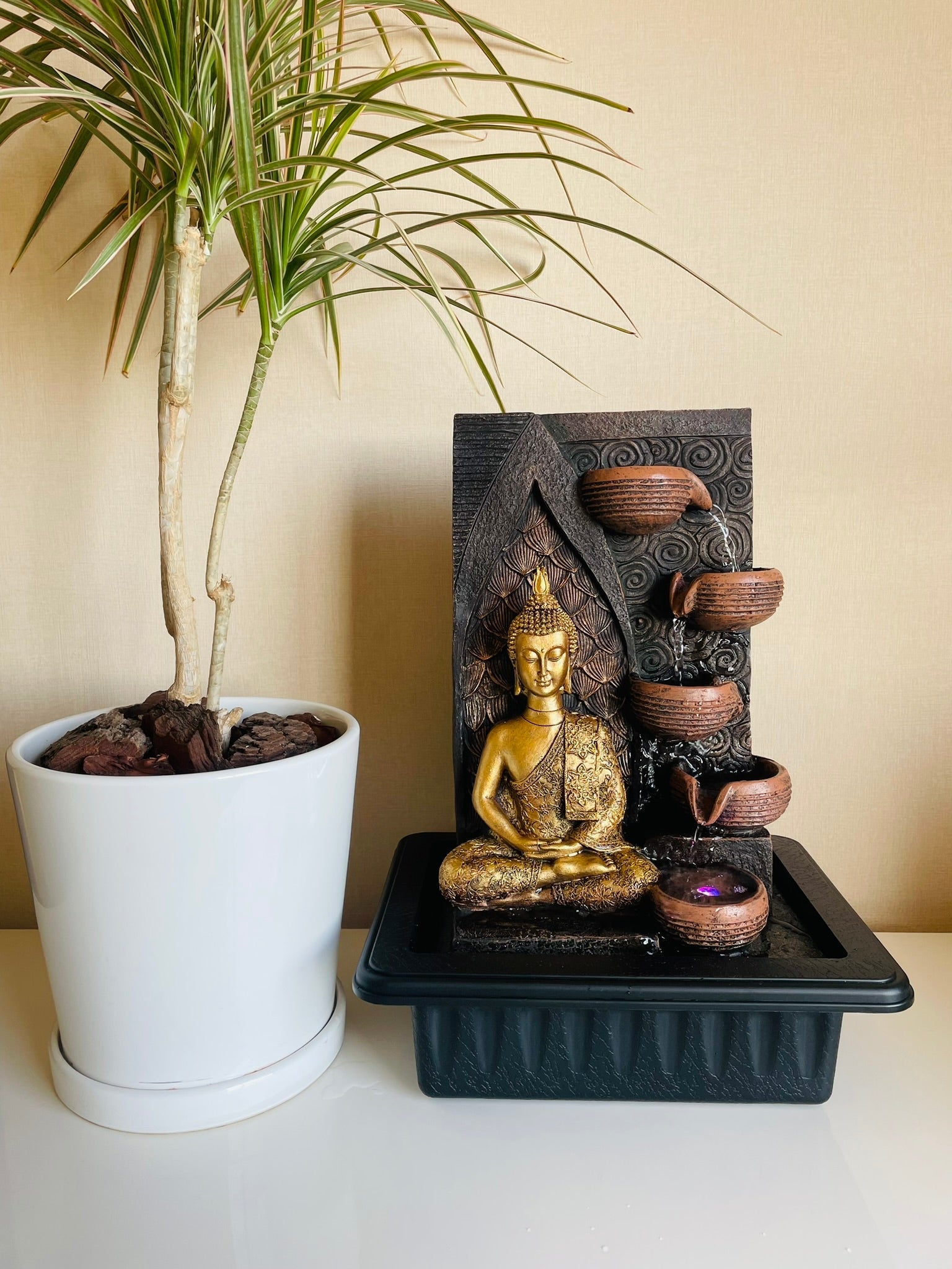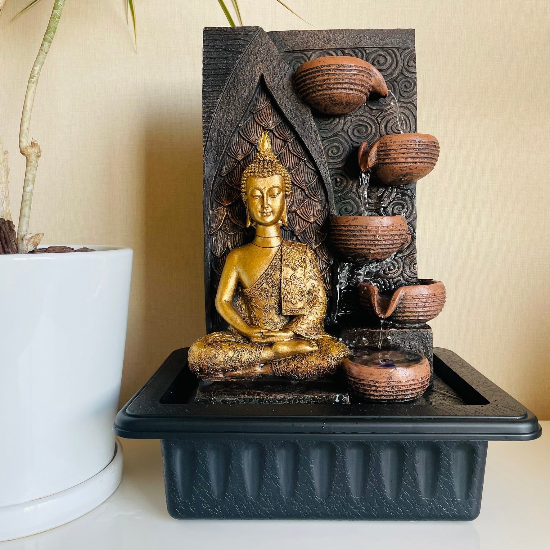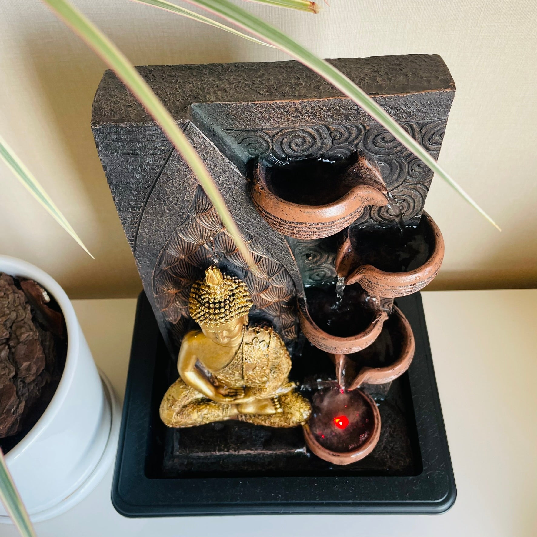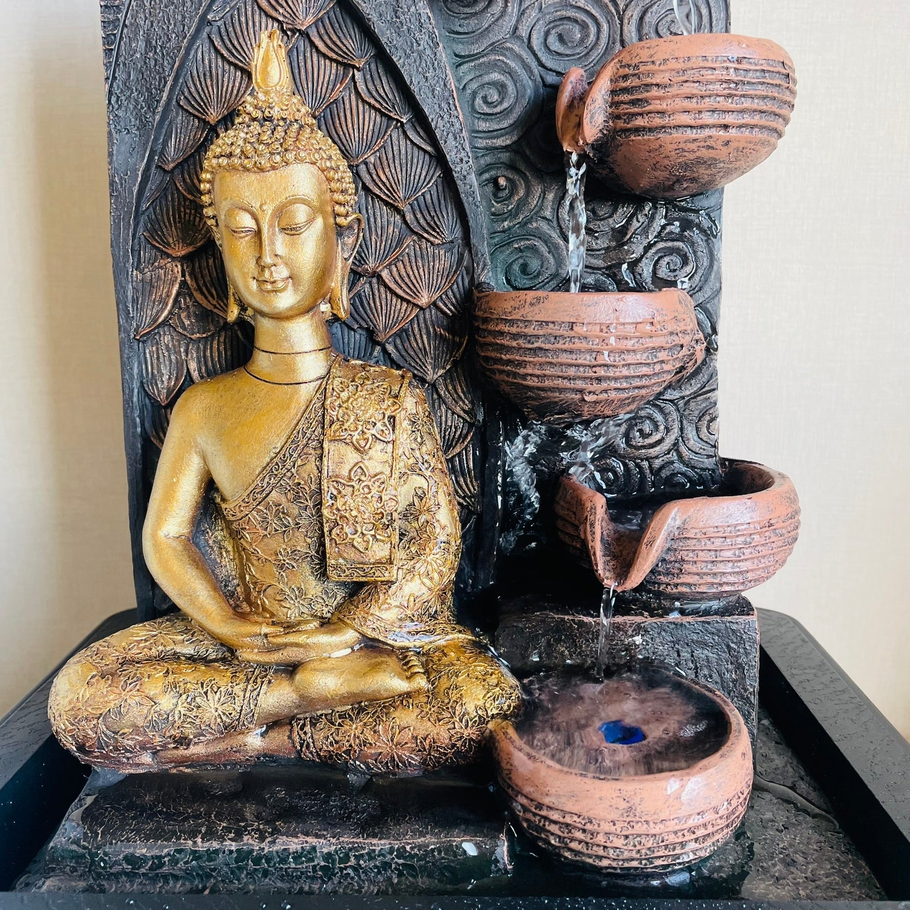 Fuente de agua de poliresina con diseño de buda y cantaros tamaño "L". Cuenta con luz multicolor y enchufe para conectarla a la electricidad. El Buda es un símbolo inspirador de autosuperación, vitalidad y sentimientos nobles. Ayuda a recuperar el eje antes de perder el rumbo. Un complemento decorativo infaltable si quieres agregar serenidad a tu hogar. Las fuentes de agua son ideales para combinarlas con plantas, ya que les aportan humedad y ayudan a evitar el estres por resequedad en el ambiente.