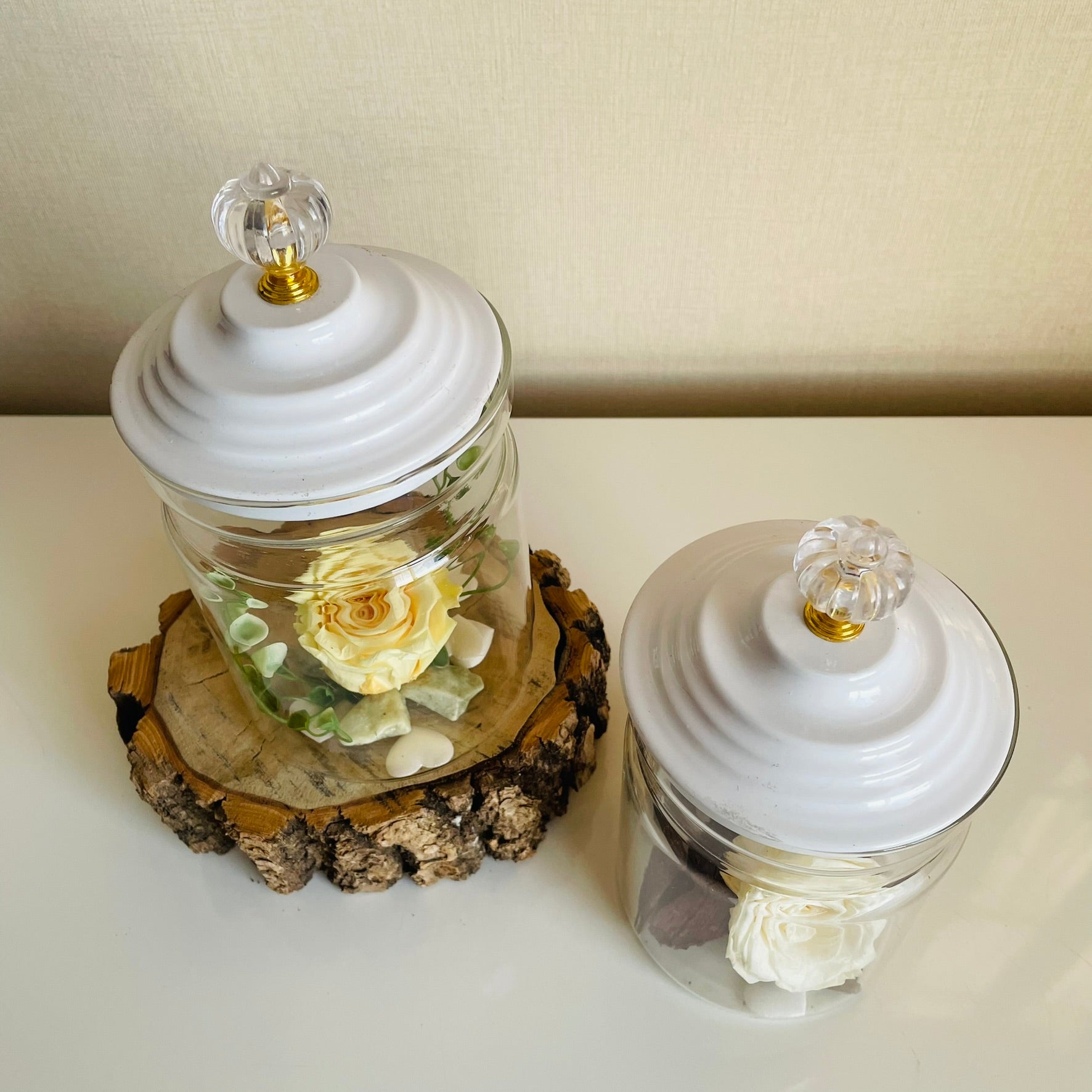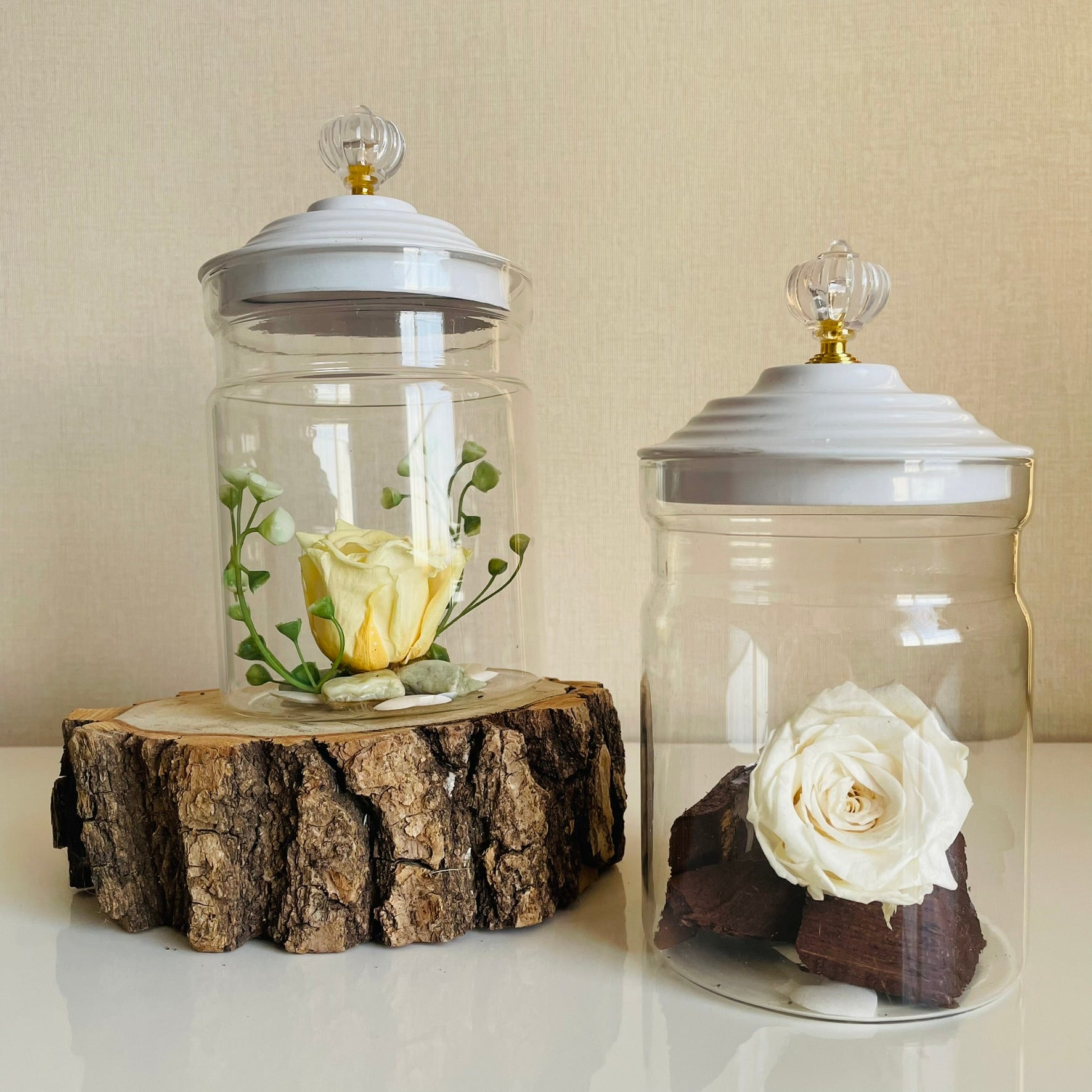 Rosa eterna en cúpula de vidrio con tapa de metal. La rosa eterna o rosa preservada, no se trata de rosas artificiales, son rosas naturalmente cultivadas que después de ser recogidas, tanto la flor como el tallo y su hojas, reciben un exclusivo proceso de liofilización, de esta manera la rosa mantiene su apariencia natural de color y textura, la cual puede durar más de 3 años.